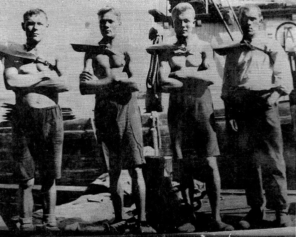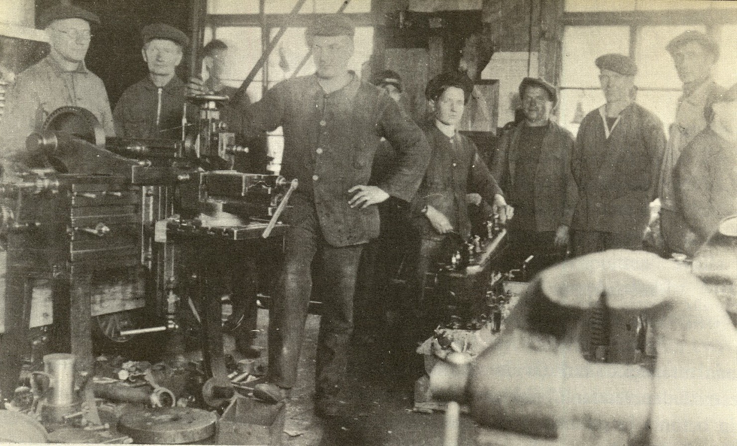 Ravansaarella toimi Ahlströmin ja Virolaisen telakat. Kuvassa telakan verstaan väkeä, Lauri vasemmalla.