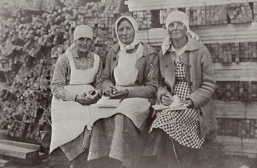 Mummoni Hilda Maria Käki os. Ala-Rakkola (1897-1964) asui Ravansaarella. Hilda, kuvassa vasemmalla, toimi 1920-luvulla puutavarayhtiön ylösottajana eli ulkoilmakonttoristina. Ylösottajien tehtävänä oli merkitä puutavaran pituudet ja määrät muistiin, kun lankunkantajat huusivat ne englanninjalkoina (0,3048 metriä).