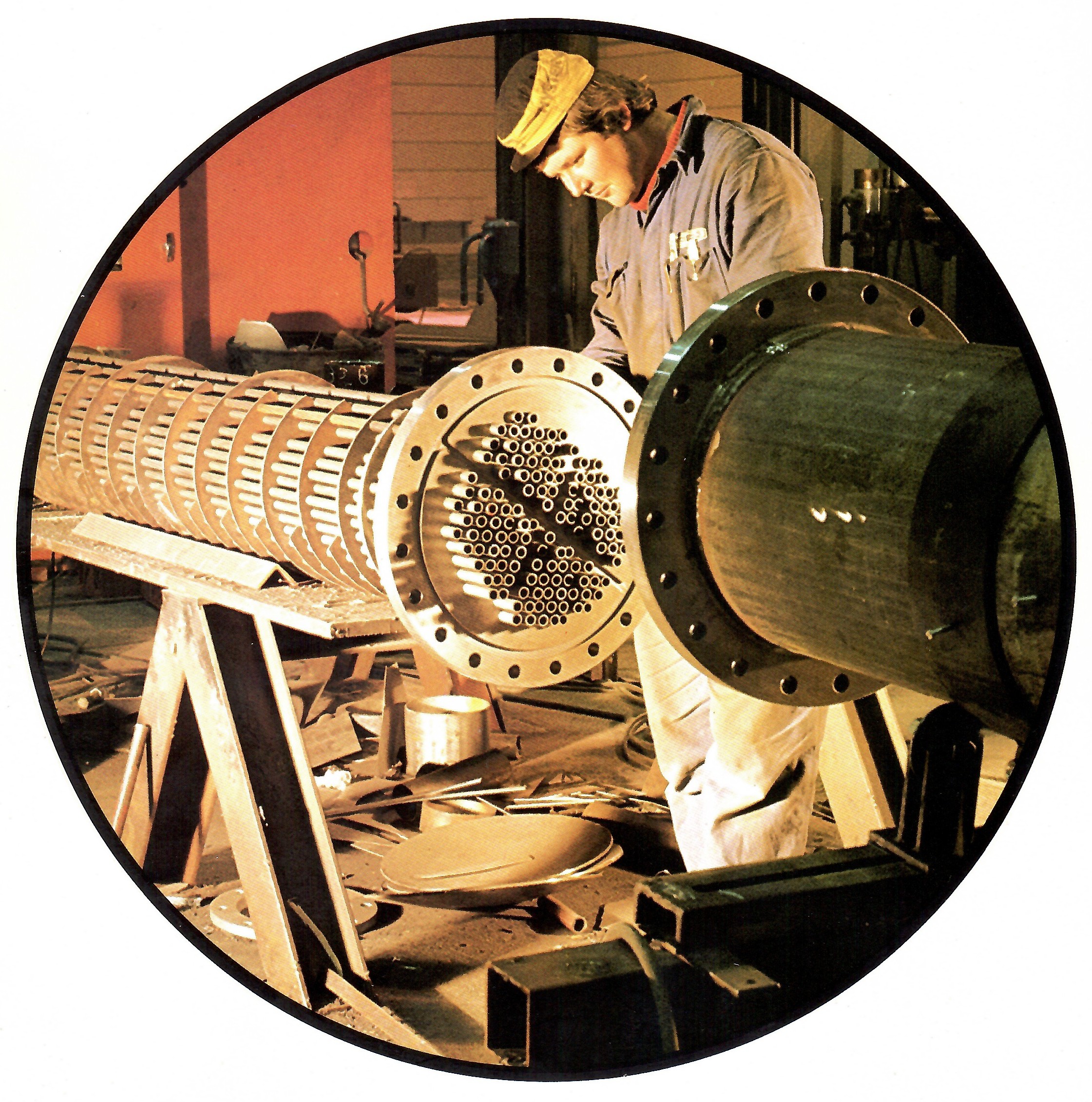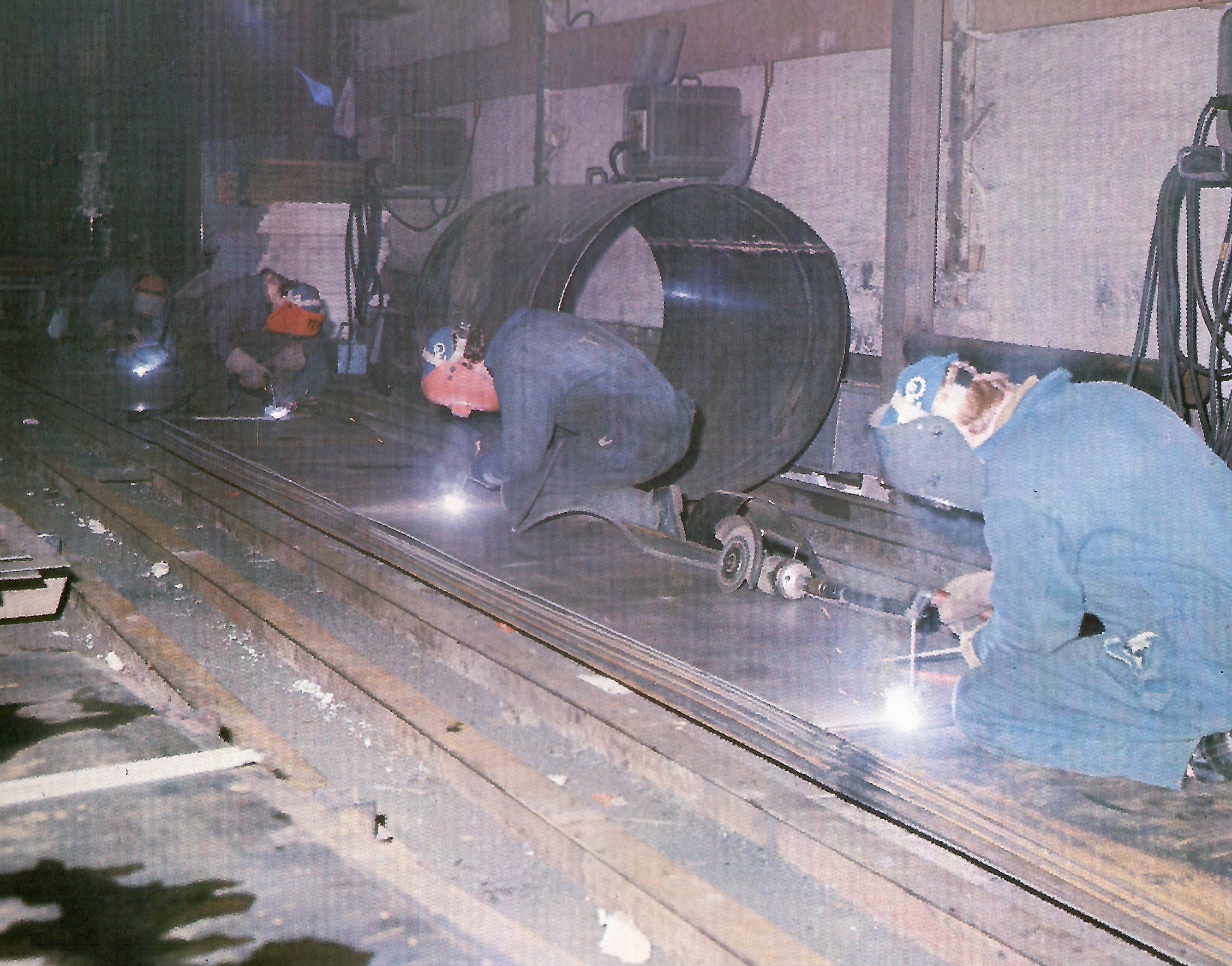 1970-luvun alussa ensimmäisessä 650 m2 levyhallissa hitsataan säiliön osia.