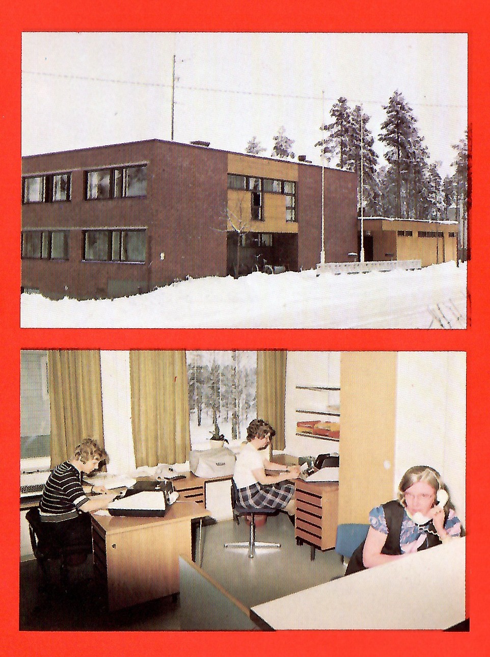 Kuvassa näkyy Tehkon Nevantien konttori. Kuvassa keskellä Tuula Käki, Kirjanpitäjä Leena Räisänen ja Irja Nissinen. Komennusmiehet kävivät perjantaisin hakemassa tiskiltä ”kottia” ja etupiha oli täynnä autoja.
