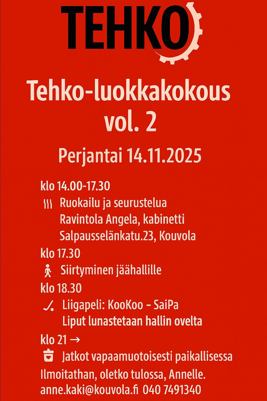 Matti Koskinen ja Anne Käki kutsuivat toiseen luokkakokoukseen Kouvolaan. Tapaamisessa oli jälleen monta Tehkolaista: